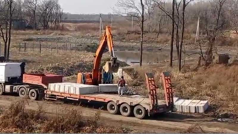 Сейчас подрядчик ООО «СпецДорСтрой» продолжает завоз и монтаж железобетонных блоков парапета для устройства гребня дамбы, идут земляные работы.