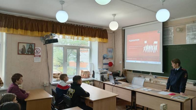 Школьникам старших классов сотрудник полиции продемонстрировала видеоролик, разъясняющий основные аспекты, связанные с такими понятиями, как «экстремизм» и «терроризм», рассказала об ответственности за распространение информации, направленной на возбуждение ненависти или вражды, а также на унижение человеческого достоинства. Затем она напомнила о правилах безопасного поведения в социальных сетях, рекомендовала школьникам не размещать на своих страницах материалы, способные возбудить ненависть, либо вражду по отношению к другим людям, а также не оставлять комментариев, оправдывающих действия экстремистов и террористов.
