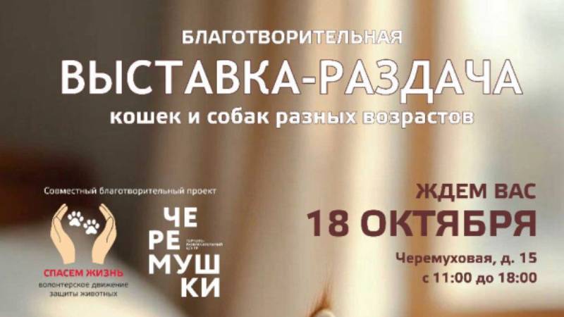В эту субботу, 18 октября, во Владивостоке пройдет благотворительная выставка-раздача бездомных животных. Она организована волонтерским движением «Спасем жизнь» при поддержке администрации города в рамках проекта «Животные города_В».