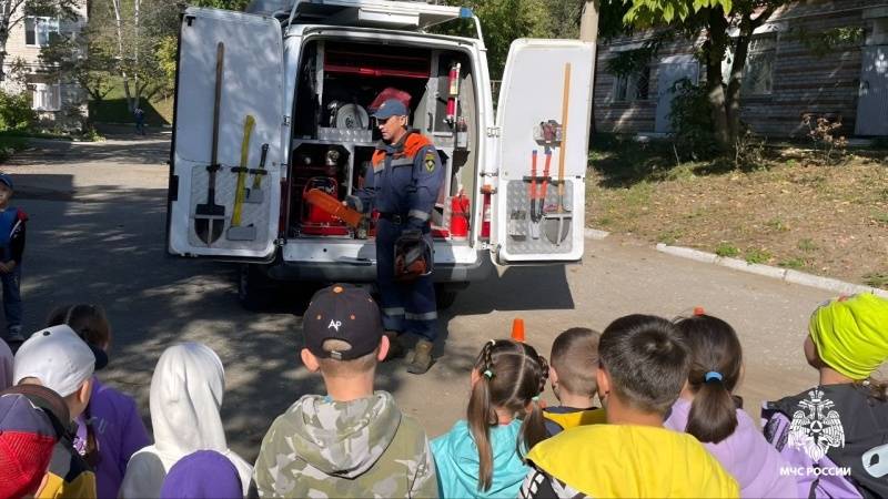 Спасатели МЧС России провели экскурсию по технике и оборудованию: дети заглянули в кабину, посидели за рулём и лично познакомились с аварийно-спасательными средствами — аптечкой, спасательным гидрокомбинезоном, альпинистским снаряжением и комплексом аварийно-спасательных инструментов. Гости поочерёдно называли предметы, объясняли их назначение и ответили на все вопросы любознательных малышей.